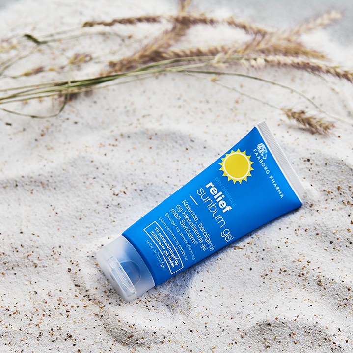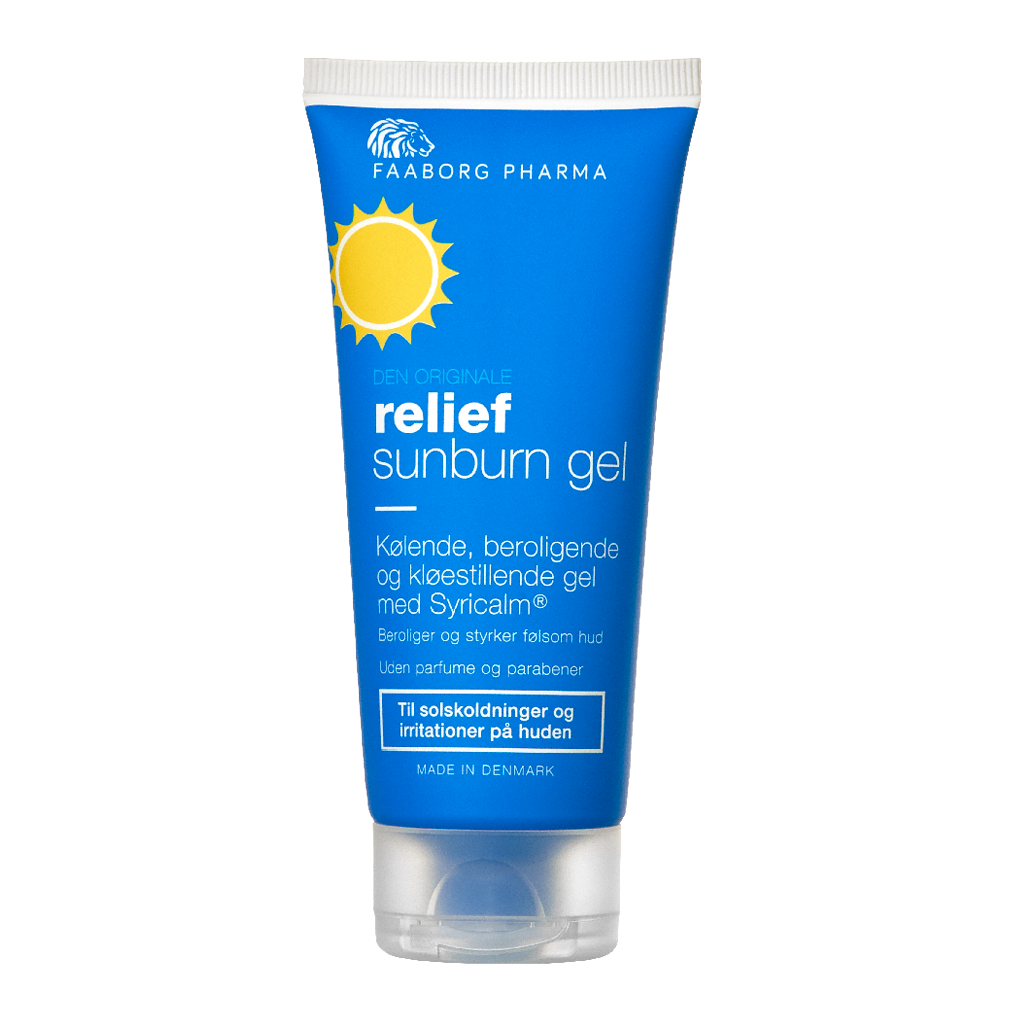 relief sunburn gel virker, kølende og reparerende, hvis uheldet er ude og huden bliver solskoldet.